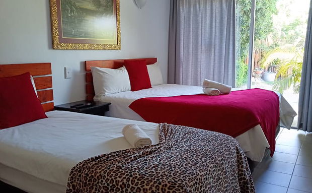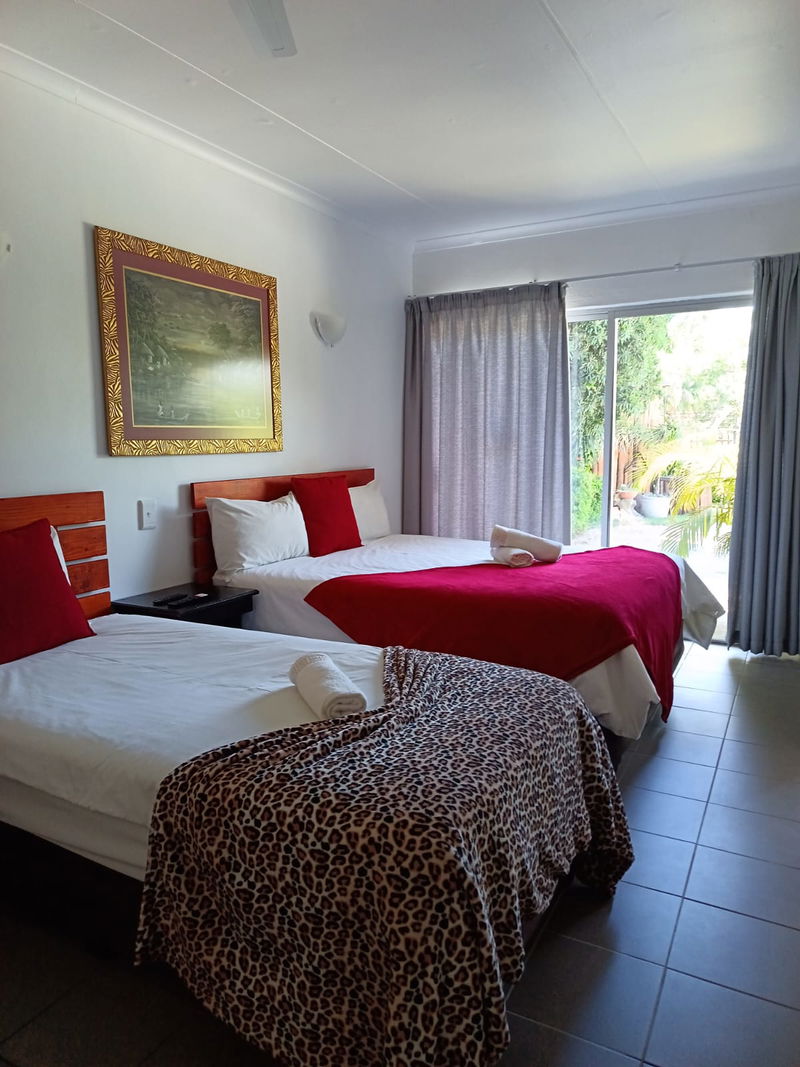 Spacious ground floor double unit sleeping max. 3 with 1 queen bed and 1 single bed, industrial ceiling fan, a fully equipped kitchenette with fridge/freezer, microwave, kettle, Smart TV & DSTV, separate toilet and shower, private entrance and own private patio with braai area.